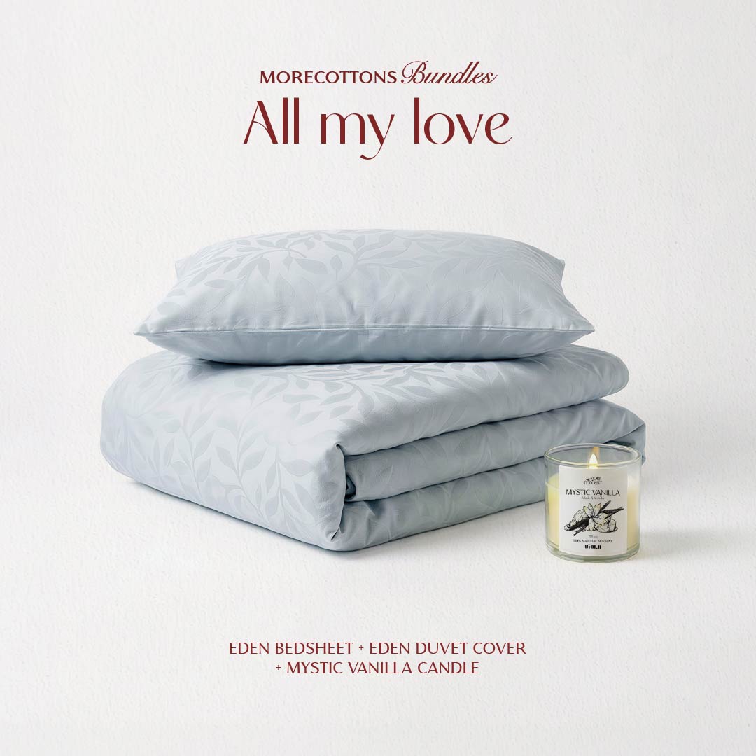The All My Love Bundle combines refined jacquard bedding with a warm, inviting scent. The soft texture and muted tones create a relaxed, cozy feel, while the Mystic Vanilla candle adds gentle notes of vanilla and musk.