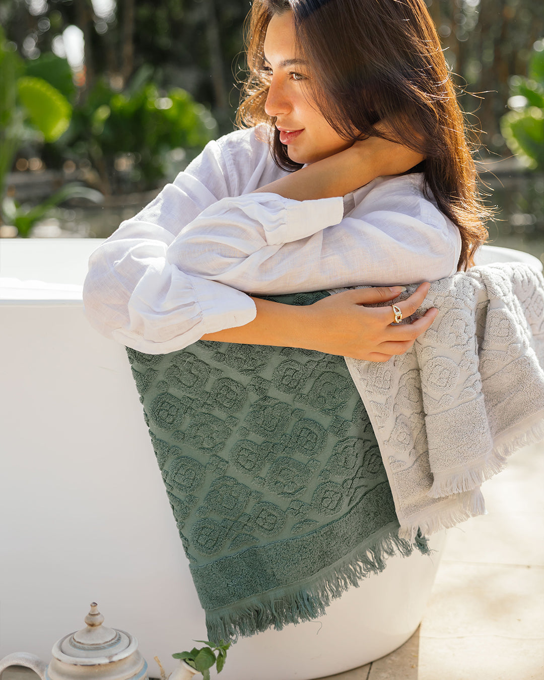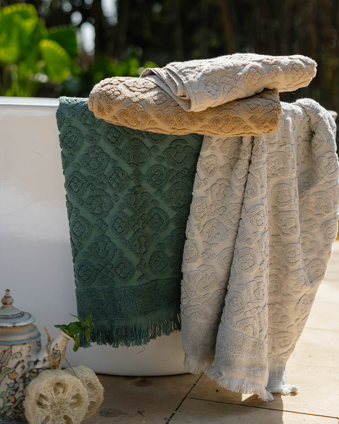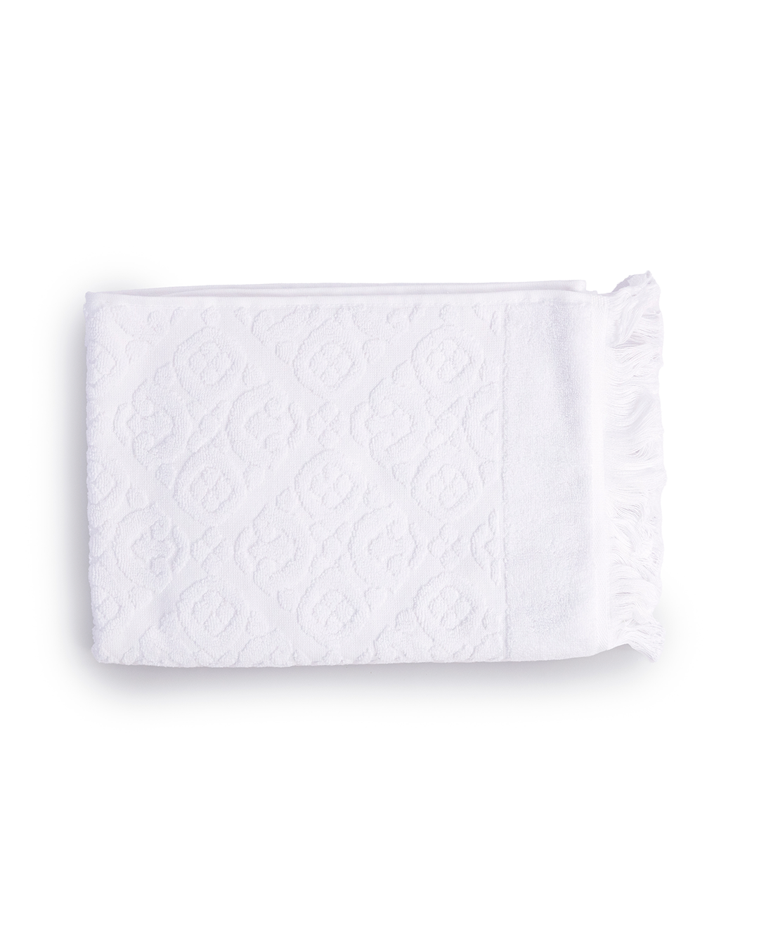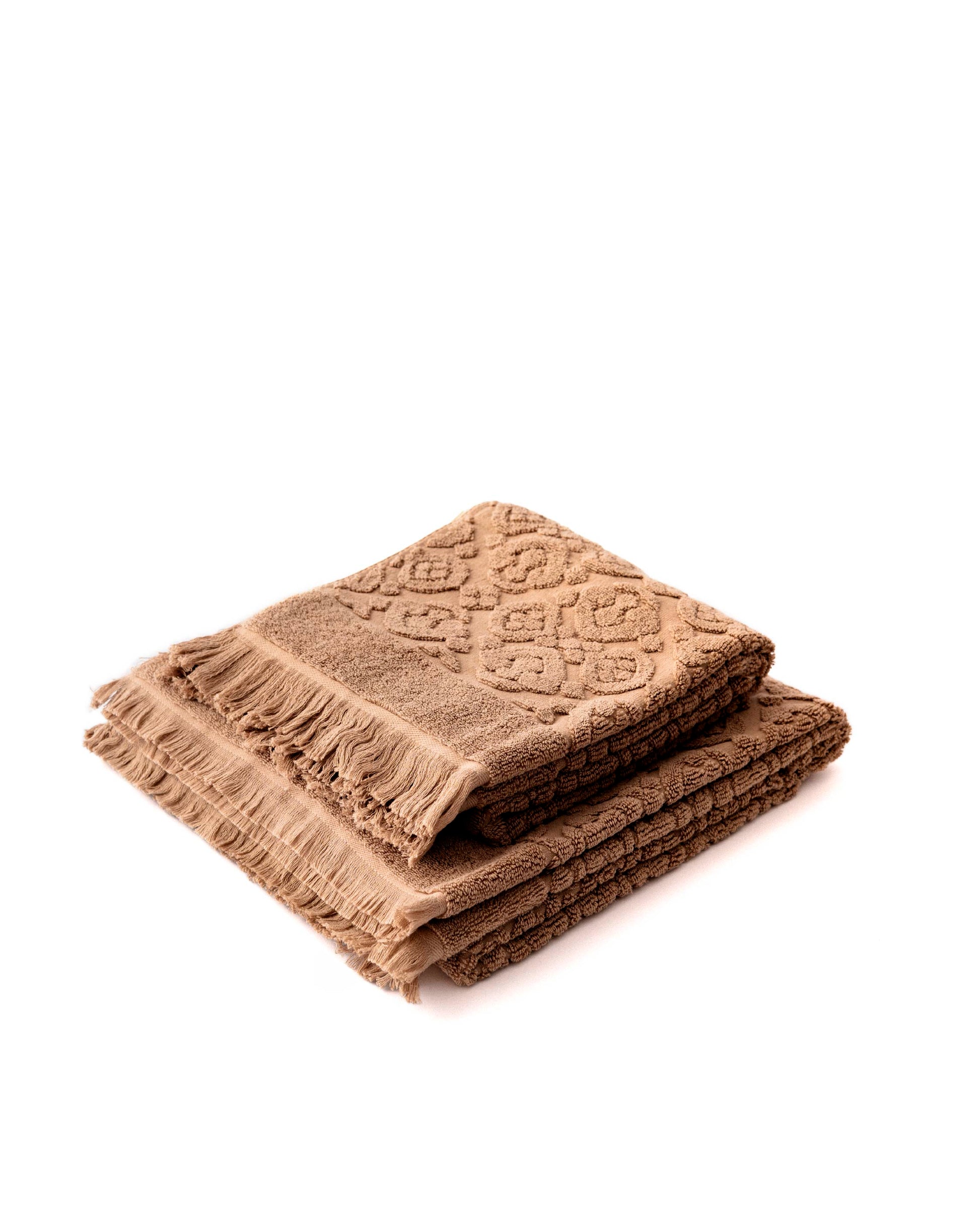 Arabesque Bath Towel with Fringes made from 100% cotton, combining a luxurious plush feel with an elegant Arabesque pattern and timeless fringe accents for a refined bathing experience.