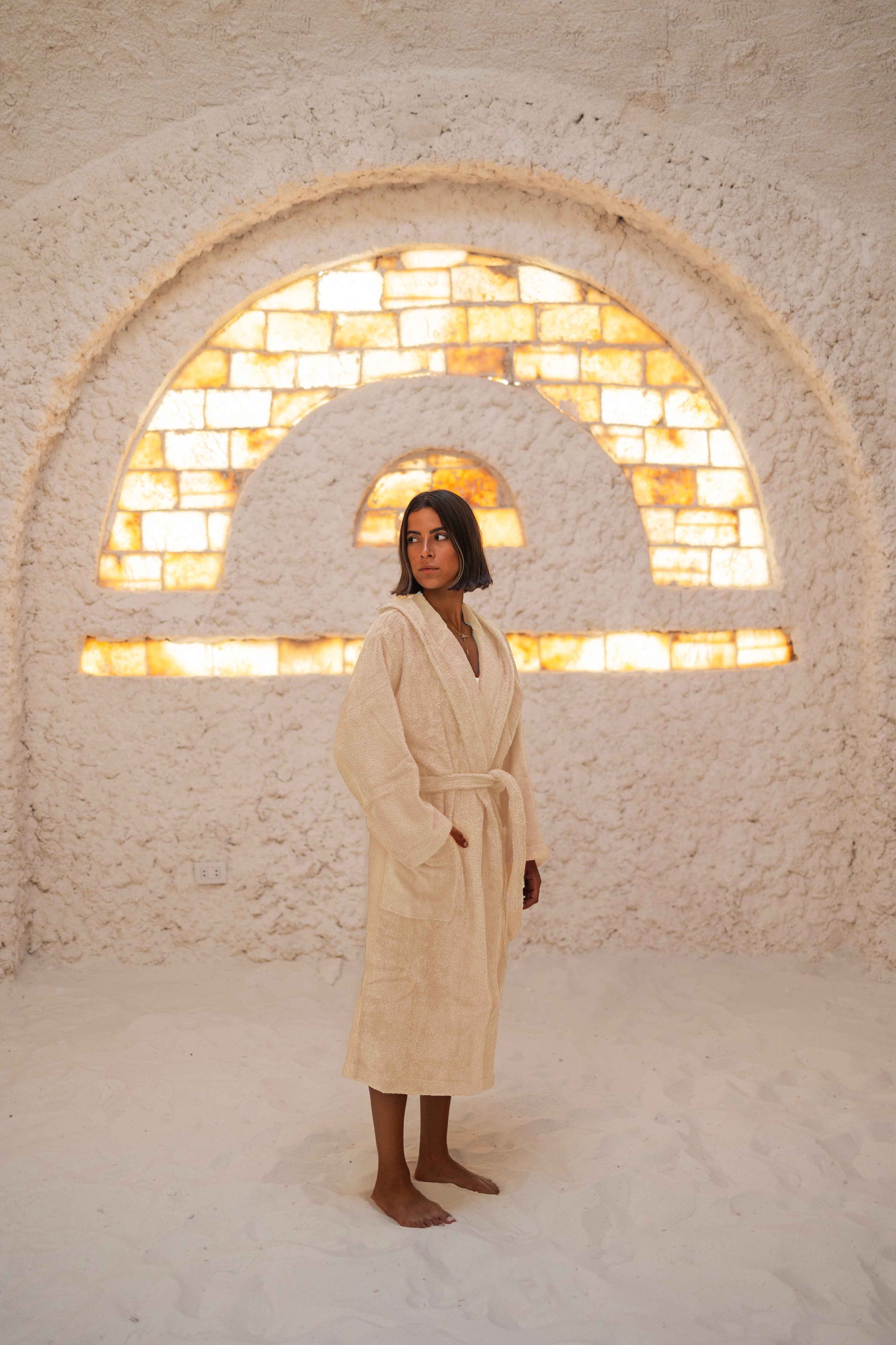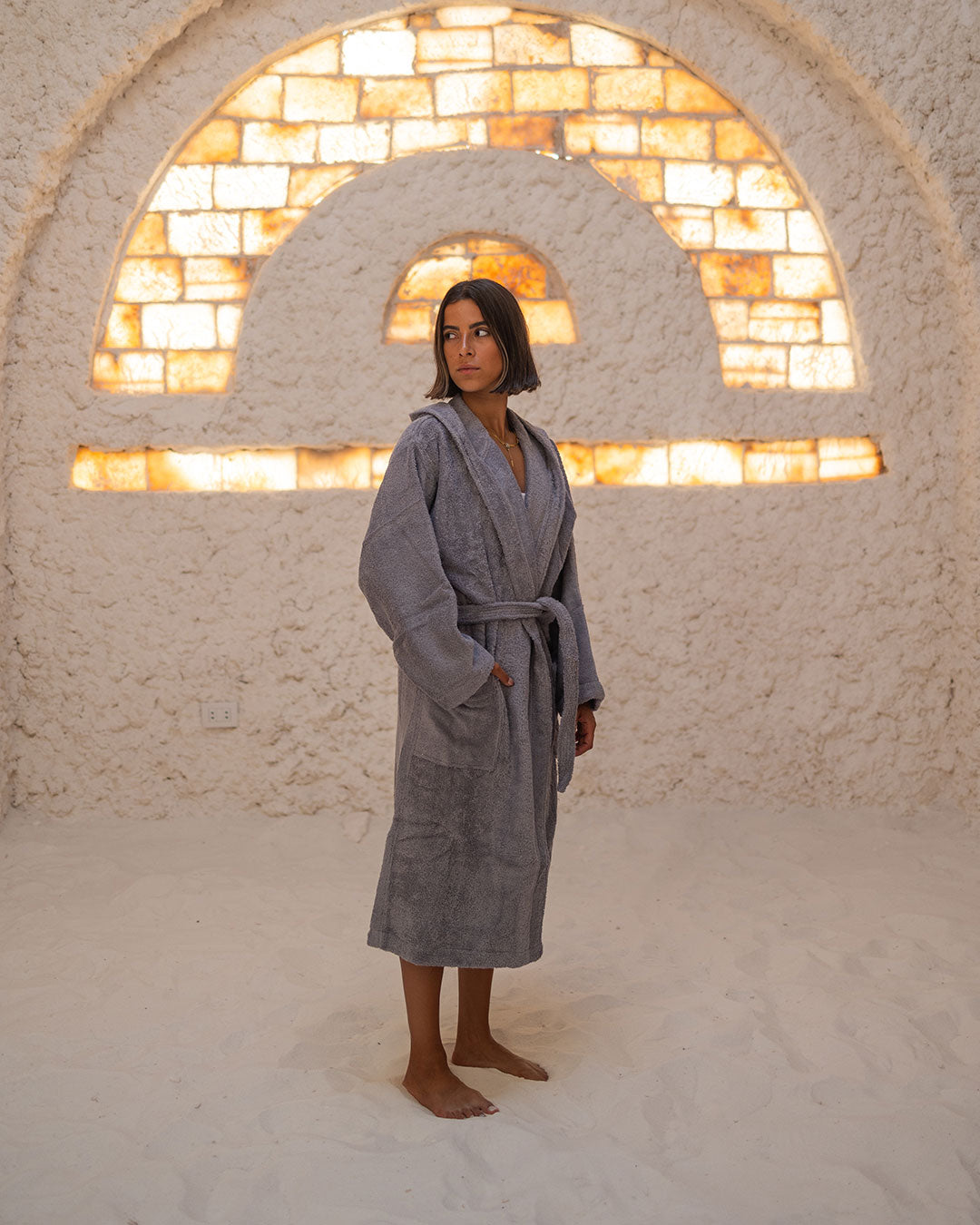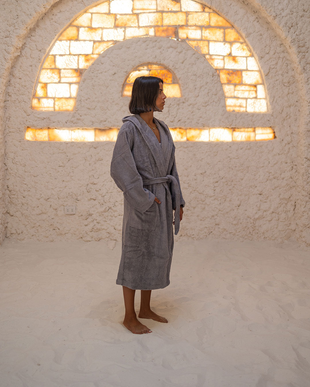 The Plain Bathrobe is made from 100% cotton with a plush, breathable weave for superior softness, absorbency, and durability. Designed with a hood, belt, spacious pockets, rolled cuffs, and hanger loop, it’s perfect for comfortable, relaxing post-bath moments and suitable for sensitive skin